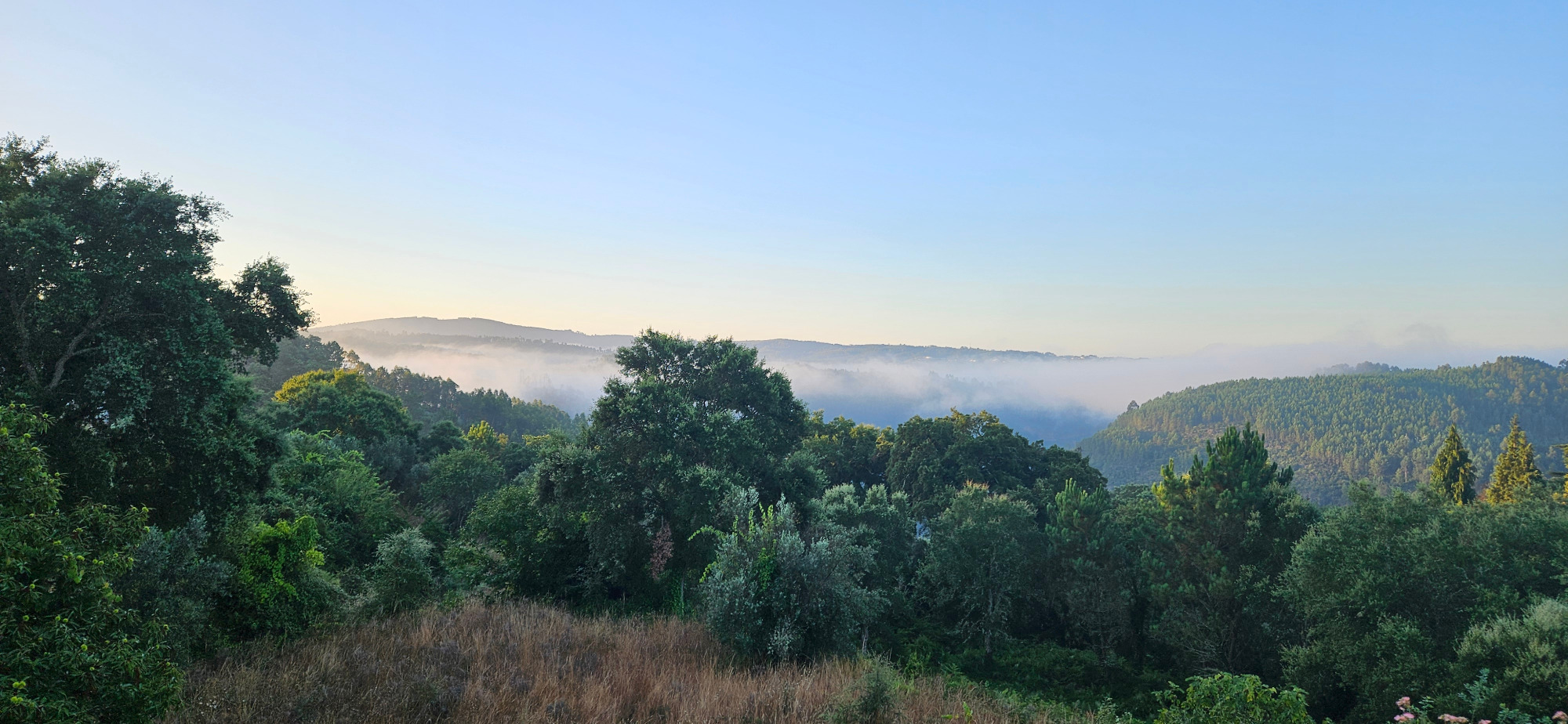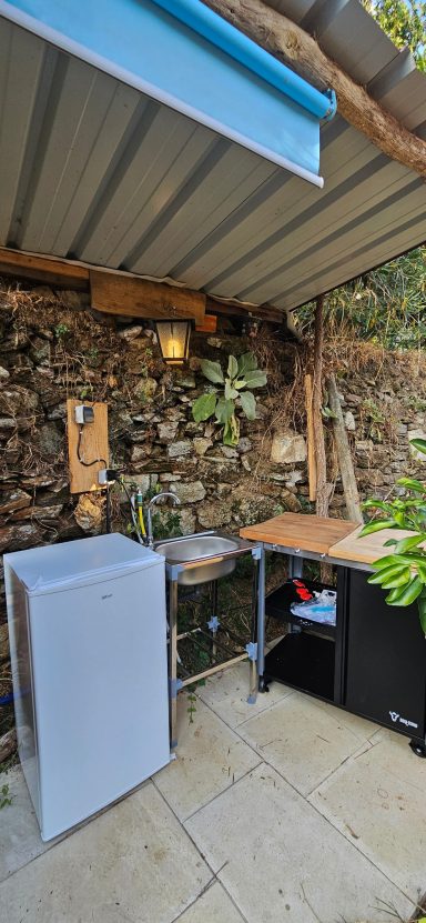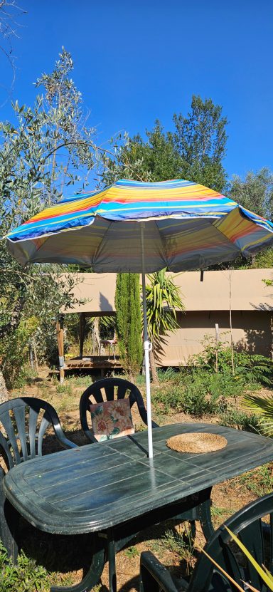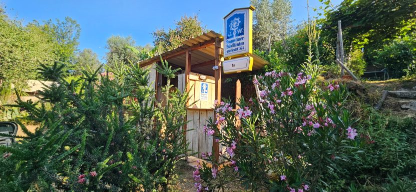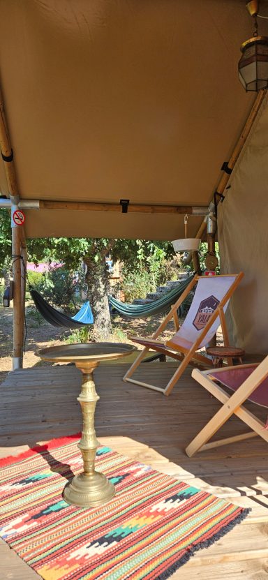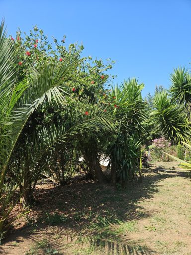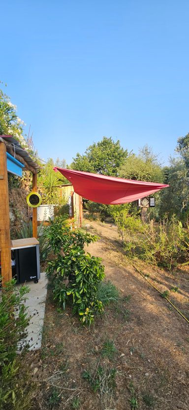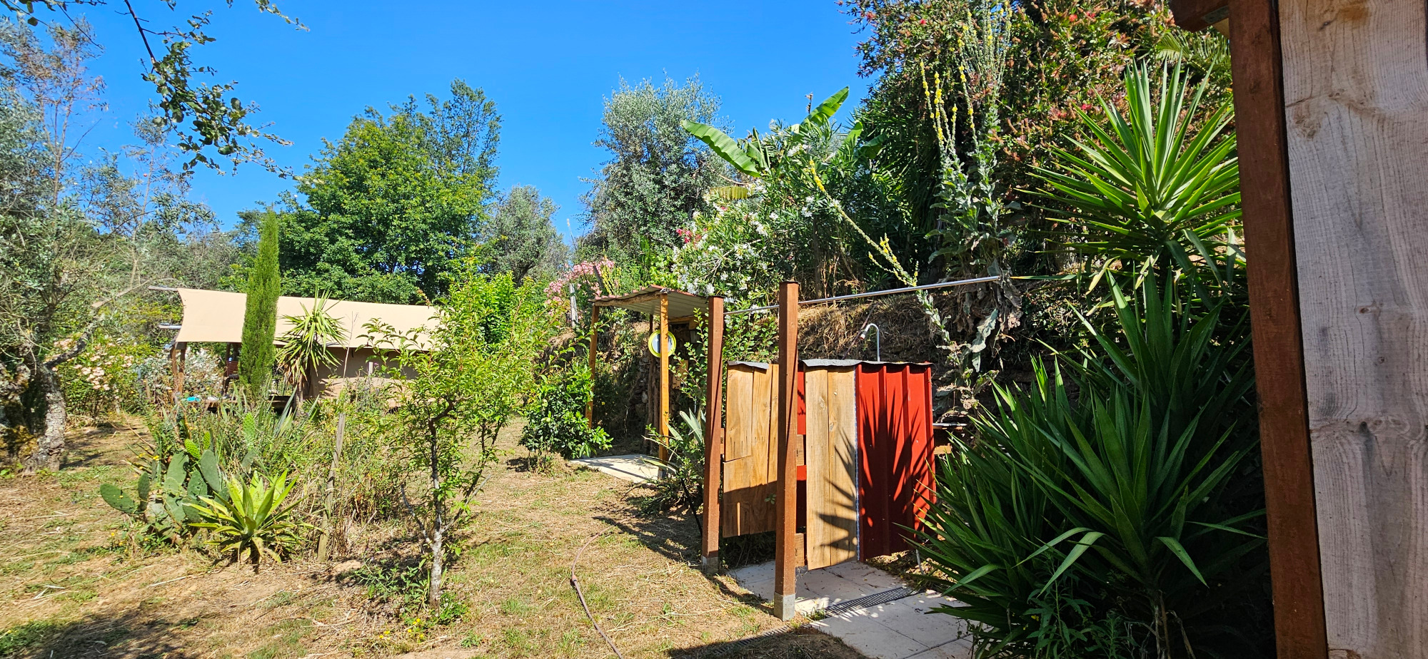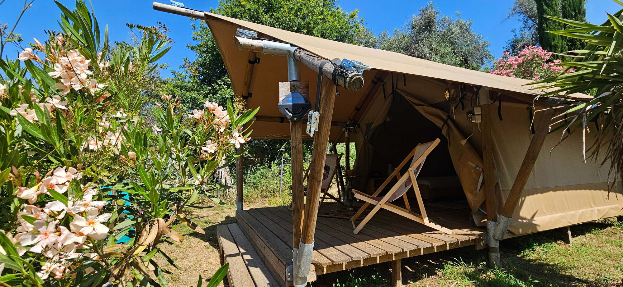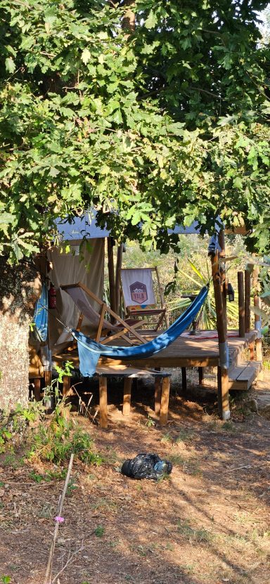 Die Campsite wurde eingefügt in eine der unteren Kulturterrassen des weitläufigen Grundstücks. Dadurch liegt sie abseits von den Häusern mit viel Privatspäre. Der Blick geht in den Korkeichenwald, die zwei Zelte sind umgeben von Olivenbäumen und mediterranen Zier- und Obstbäumen. Der Zugang erfolgt über einen separaten Fussweg, die Autos könne oberhalb des Grundstücks geparkt werden.