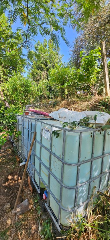 Für die Bewässerung des Grundstücks stehen große Tanks bereit, die mit