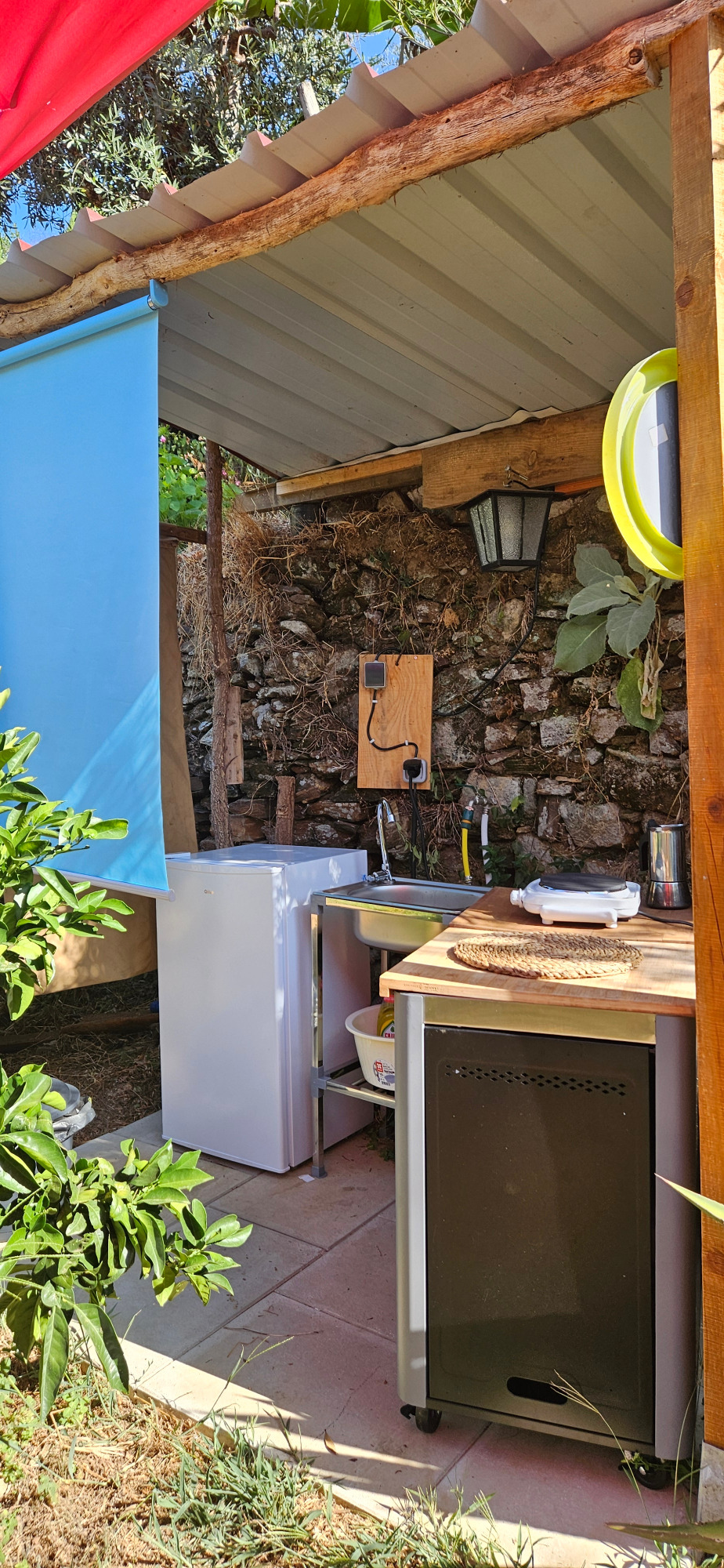 es eine Küche und Sanitärgebäude mit Solardusche, Toiletten, Spüle,